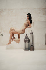 Layla dress with long slit detailing at front and low back cut. Available in the shades of Creme and Rust.
